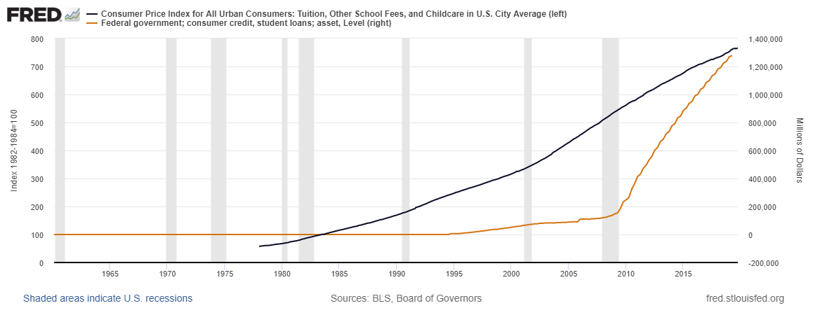 The growth in student loans is even more drastic and well understood. According to Experian, student loans have grown from approximately $650 billion in 2009 to $1.41 trillion in 2019 . According to the National Center for Education Statistics, 19.9 million students were enrolled in colleges and universities at the start of 2019. At this level of debt and with the current student population, this averages out to $70,351 of student loans per student. The average starting salary for a college graduate is around $51,000 (SHRM). This is a well repeated argument, but the intent here is to highlight how “making something affordable” via credit is having the exact opposite and possibly disastrous effect.